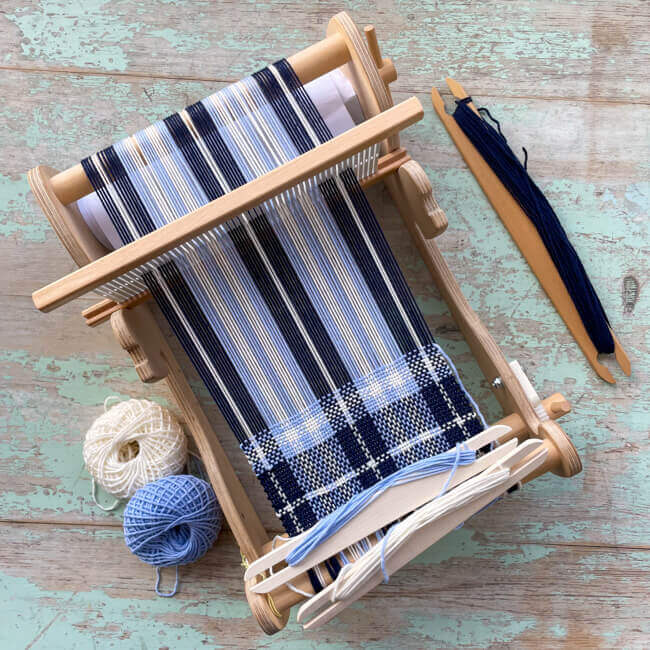 Weft: 1 ball each of Golden Fleece Merino Prato in Pure White, Aqua Blue, and Navy Blue. (Note: Golden Fleece Merino has been discontinued from our shop. We suggest DHG Rain or Shine as an alternative in the colors Deep Blue, Jeans, and Natural White)