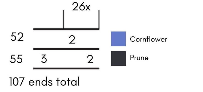 Warp Order: Warp 2 threads starting with Prune (or Color A of your choice), then 2 threads of Cornflower (or Color B). Alternate across for a total of 107* ends.