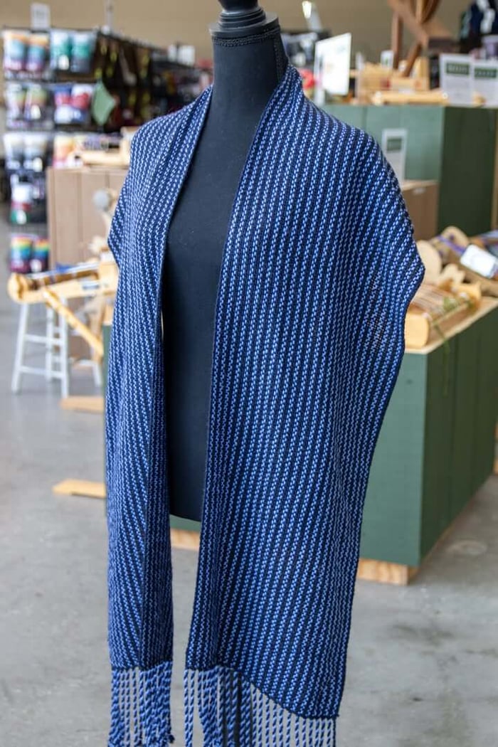 There are many possibilities for this v-shawl technique. We have woven them from yarns ranging from aran-weight wool to sock yarn to 5/2 perle cotton or bamboo. Play with different plaid patterns! See what happens if you use a different color sequence on each side! If you have a floor loom, you can even experiment with incorporating twill structures!