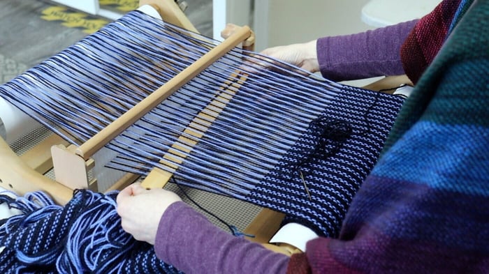Note: If you are using a floor loom, it is more time efficient to wind a longer warp for both arms at once. Remember to add extra warp length for loom waste and adjust your yardage requirements accordingly when buying yarn! Loom waste varies depending on the loom, but *generally* if using an average floor loom with roughly 24” of loom waste you will need one 5-yard warp instead of two identical 2-yard warps.