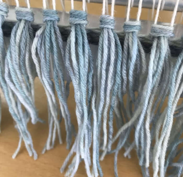I made my knots using 3 strands of yarn each. I tied each knot around two warp threads. To make your knot place your yarn across the front of your two warp threads.
