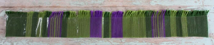 Amy warped up her loom with a 2 yard warp. We suggest you have fun and plan out your own plaid design for your bag, but if you want to make your bag look just like ours here is how Amy placed the colors in her warp: