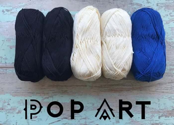 This bold choice can work with several different colors as the contrast but we picked a bright blue. Pop Art uses 2 Balls of 802 - Hueso, 803 - Negro, and 1 Ball of 833 - Azul Rey.