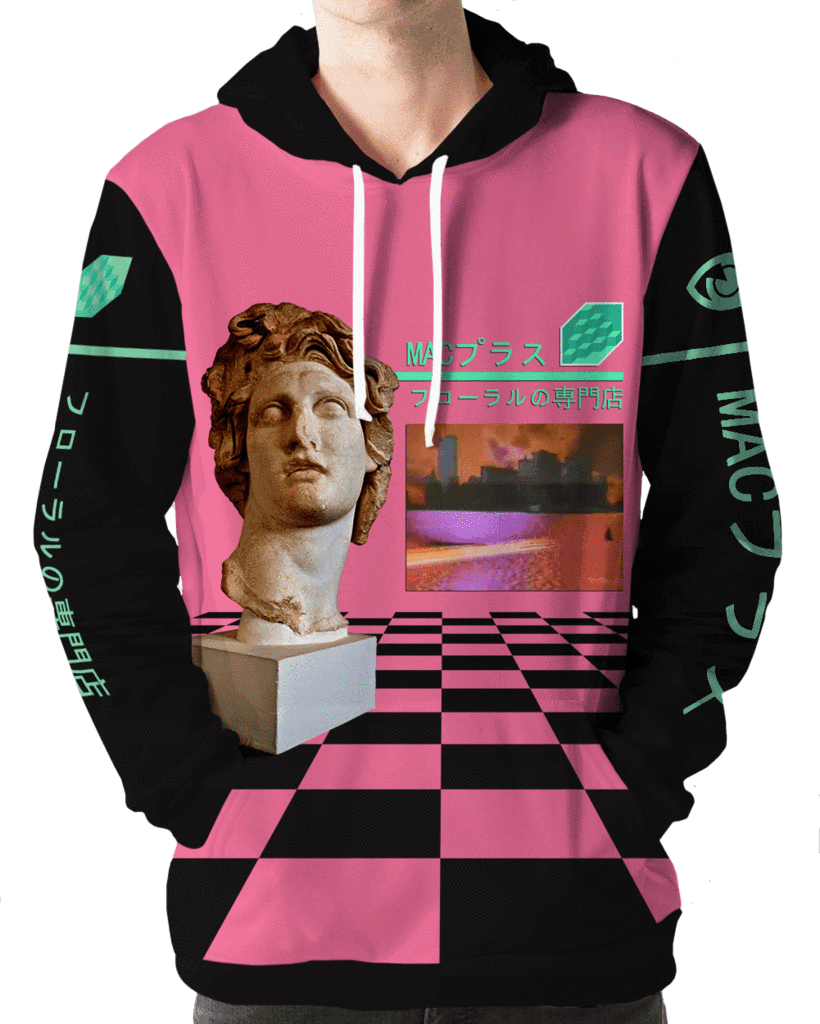 The above hoodie is from Vapor95, a website that sells exclusively Vaporwave style clothing and accessories. We challenged ourselves to make a layout of yarns that would fit comfortably into a Vaporwave wardrobe alongside pieces like this hoodie.