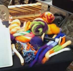 We had several different types of spinning wheels set up for folks to try in our booth - and of course, lots of spinning fiber to play with, too!