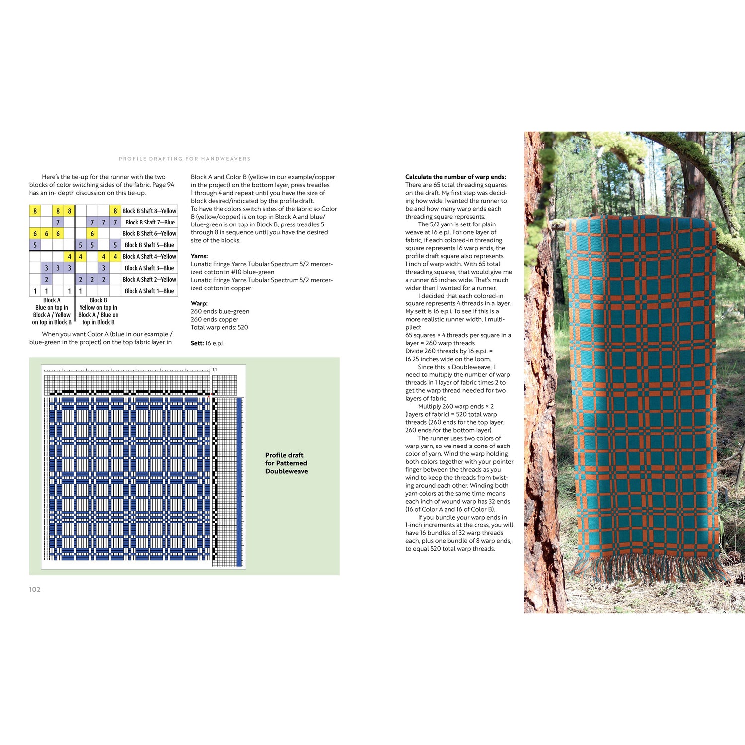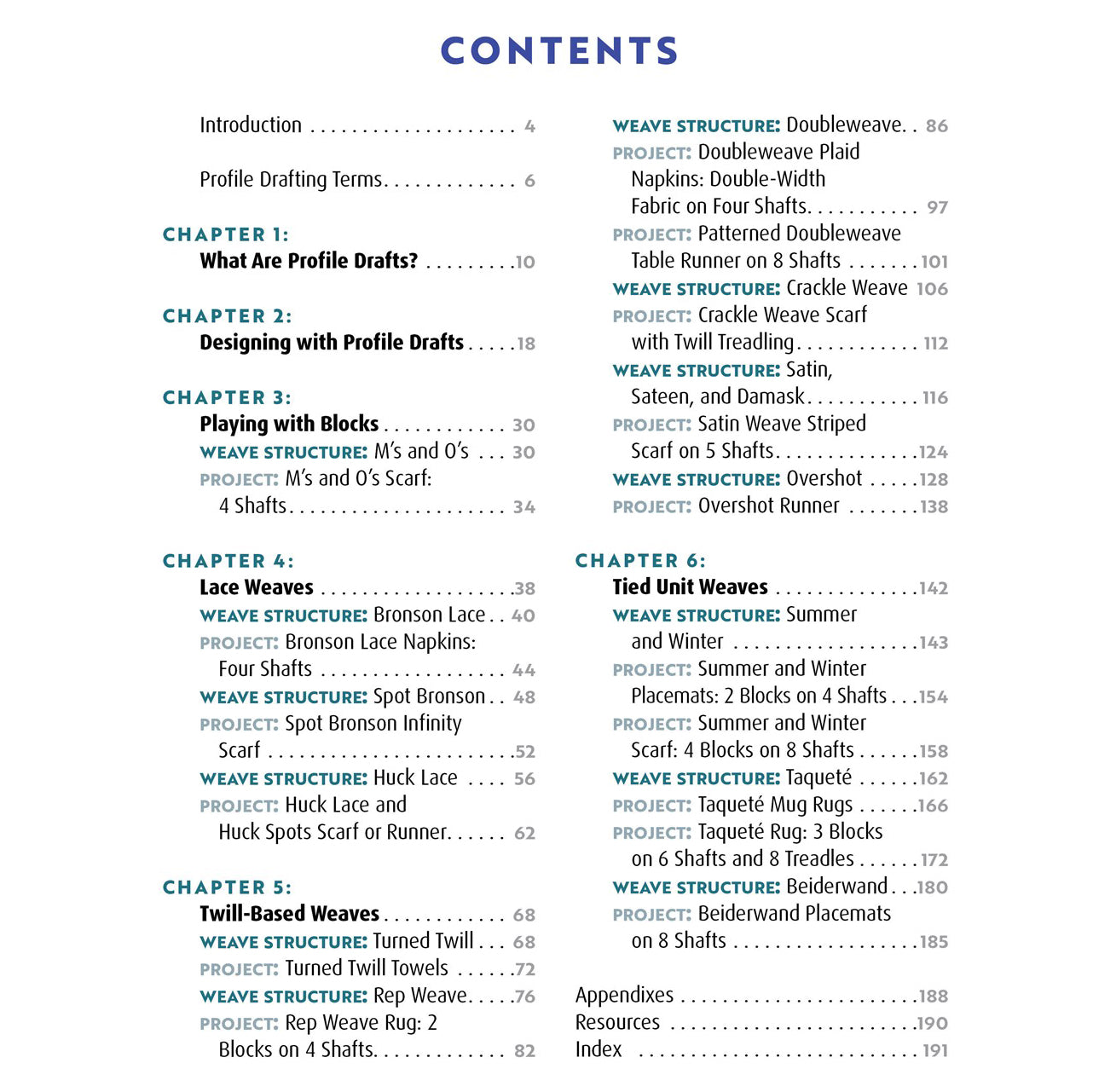 There are 16 projects in this book, and each project has a profile draft and an explanation of the weave structre, tie-ip, threading, and weaving for each weave structure.