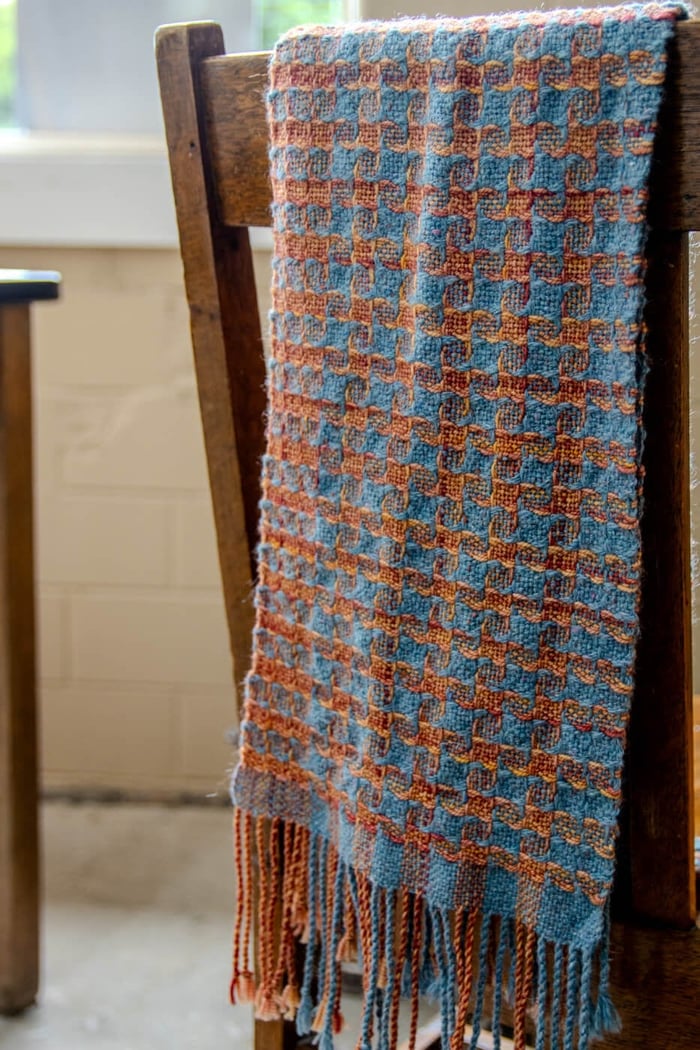 Amy wove this 'Pinwheels with Pizzazz' scarf to highlight one of the latest additions to our yarn line - Jody Long Alba! Combining the tweedy look with the hand dyed effects of Fyberspates Vivacious 4ply creates a subtle gradient effect across the scarf and makes the contrasting colors pinwheels pop while still also subtly complimenting each other.