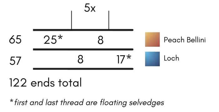 Weft (Use whatever is left over from the warp for the weft): Fyberspates Vivacious 4ply - Peach Bellini - ~204 yd ; Jody Long Alba - Loch - 211 yd