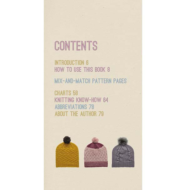 This interactive knitting book contains photographs of different hat brims, bodies and crowns that can be combined in a total of 10,626 ways to create unique hat patterns.