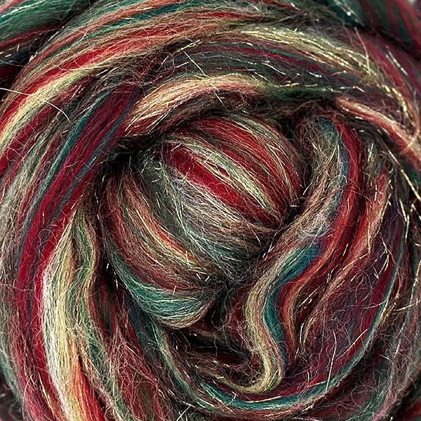Traditional Christmas colors comprised of a Corriedale Wool and Stellina blend make this Classic Christmas roving a fun and festive fiber to spin or felt for the Christmas season.