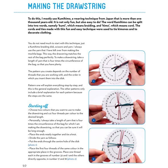 There is a comprehensive techniques section at the beginning of the book to help you get to grips with tapestry crochet, and a section at the end showing you how to make the beautifully woven straps and also the drawstrings, using the Kumihimo technique. The woven straps could also easily be made on their own as trendy belts for trousers and skirts.