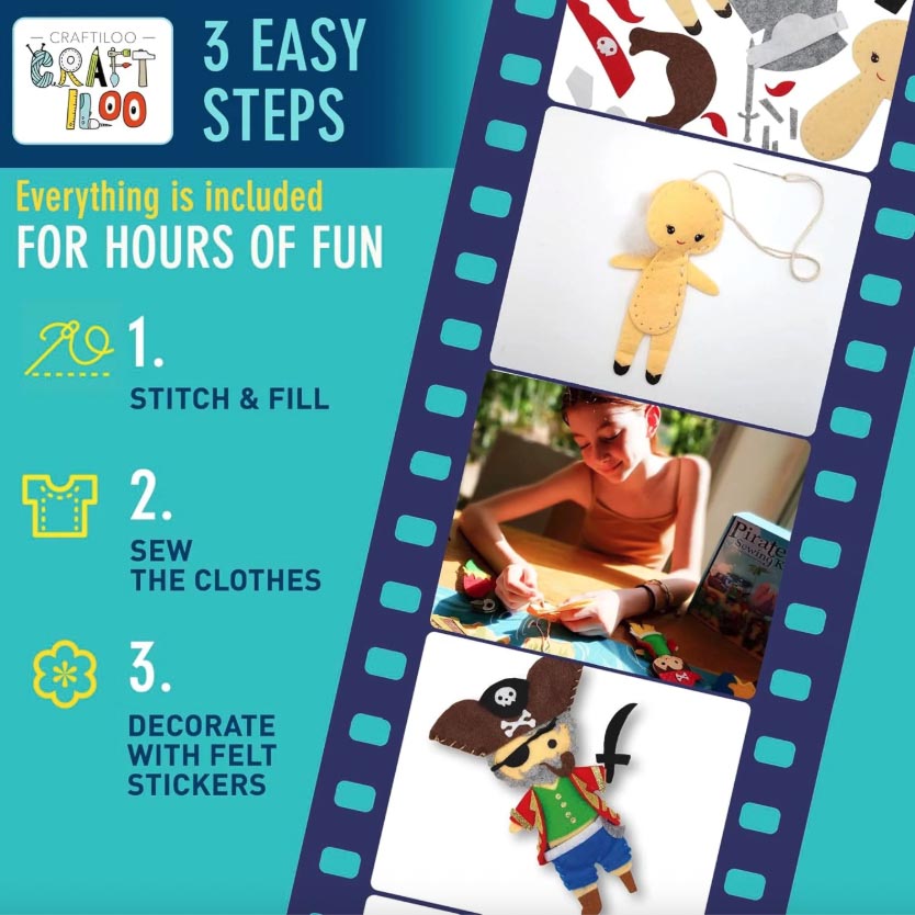 These craft kits for kids over the age of 5 teach basic sewing skills and patience. Your little ones will enjoy learning various types of stitches on the felt fabric with holes for easy sewing using the step-by-step instructions to create cute plush dolls.