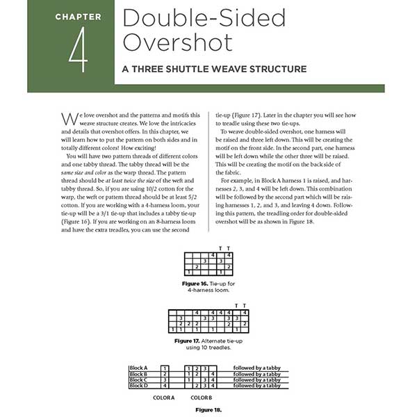 Step out of the weaving comfort zone and experiment with something new! Weave structures often have specific threading and treadling patterns that are unique to that particular weave structure and not shared with others. This book takes you out of the traditional method of weaving overshot patterns by using different treadling techniques. This will include weaving overshot patterns as Summer/Winter, Italian manner, starburst, crackle, and petit point just to name a few. The basic image is maintained in each example but the design takes on a whole new look! Each chapter walks you through the setup for each method and includes projects with complete drafts and instructions so it’s easy to start weaving and watch the magic happen! Try the patterns for scarves, table runners, shawls, pillows and even some upholstered pieces. Once you've tried a few projects, you'll be able to apply what you've learned to any piece you desire!