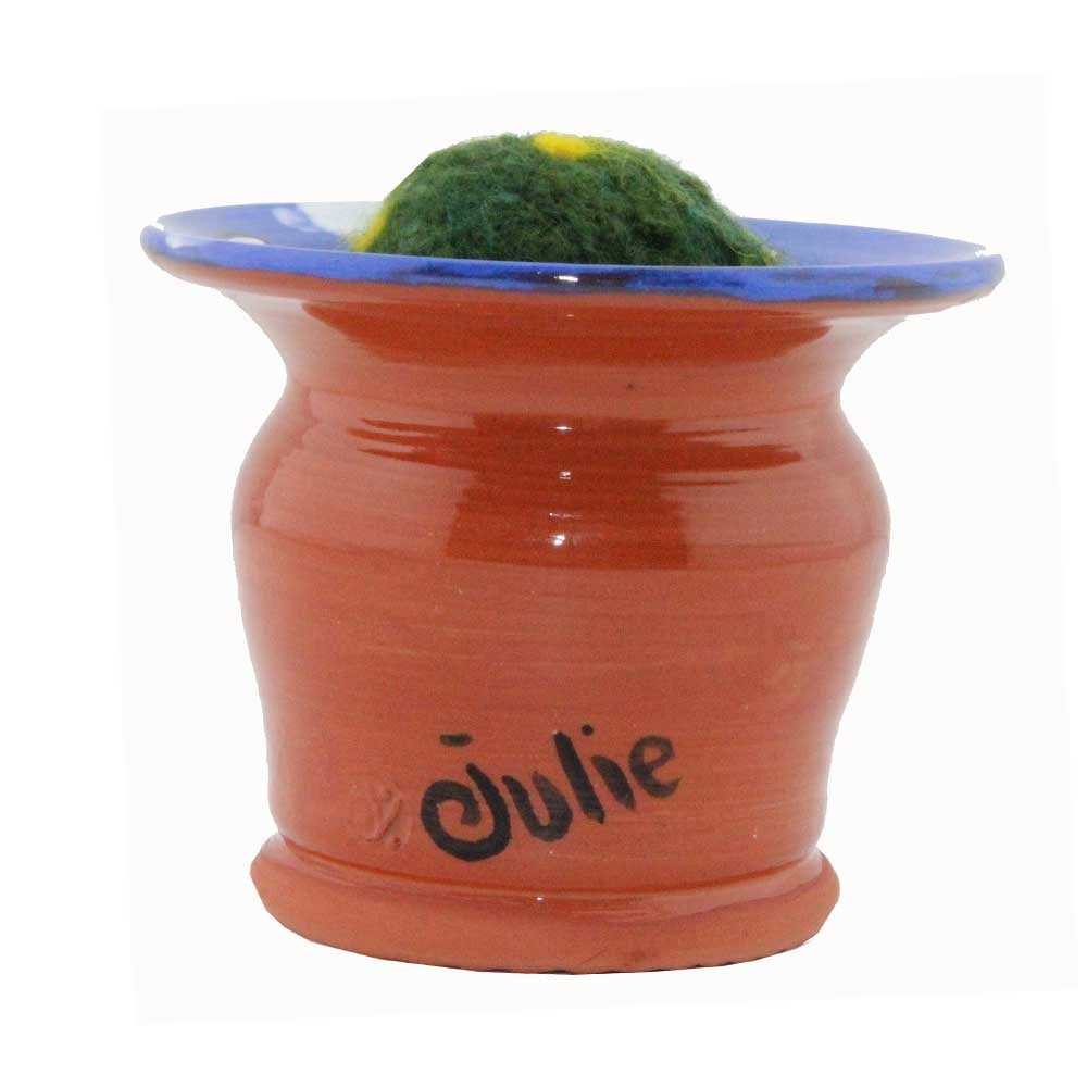 These needle holders deliver convenience and beauty. Each one is uniquely designed to accommodate the extra requirements of felting needles. This is not your momma’s "pin cushion”! Hand Painted and Hand Felted in a hand made ceramic container that is just the right depth for felting needles and are decorated with cute sheep grazing in the meadow (needles not included).