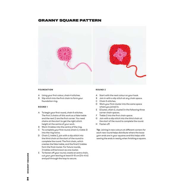 All five granny squares can be completed in a wide range of yarn weights, colors, and types; they can be extended to create bigger blocks, and they are interchangeable within the pattern designs, giving the reader unlimited options and inspiration.