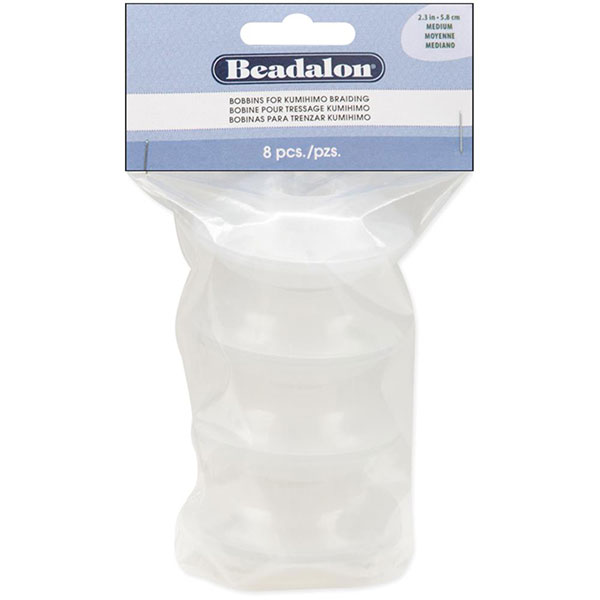 These bobbins are used to wrap your stringing materials around before using the Kumihimo disc. Each bobbin helps keep your strands tangle free by adding weight and size. Bobbins can also be used to store stringing material.