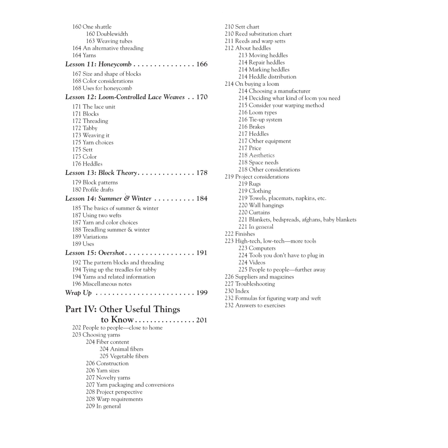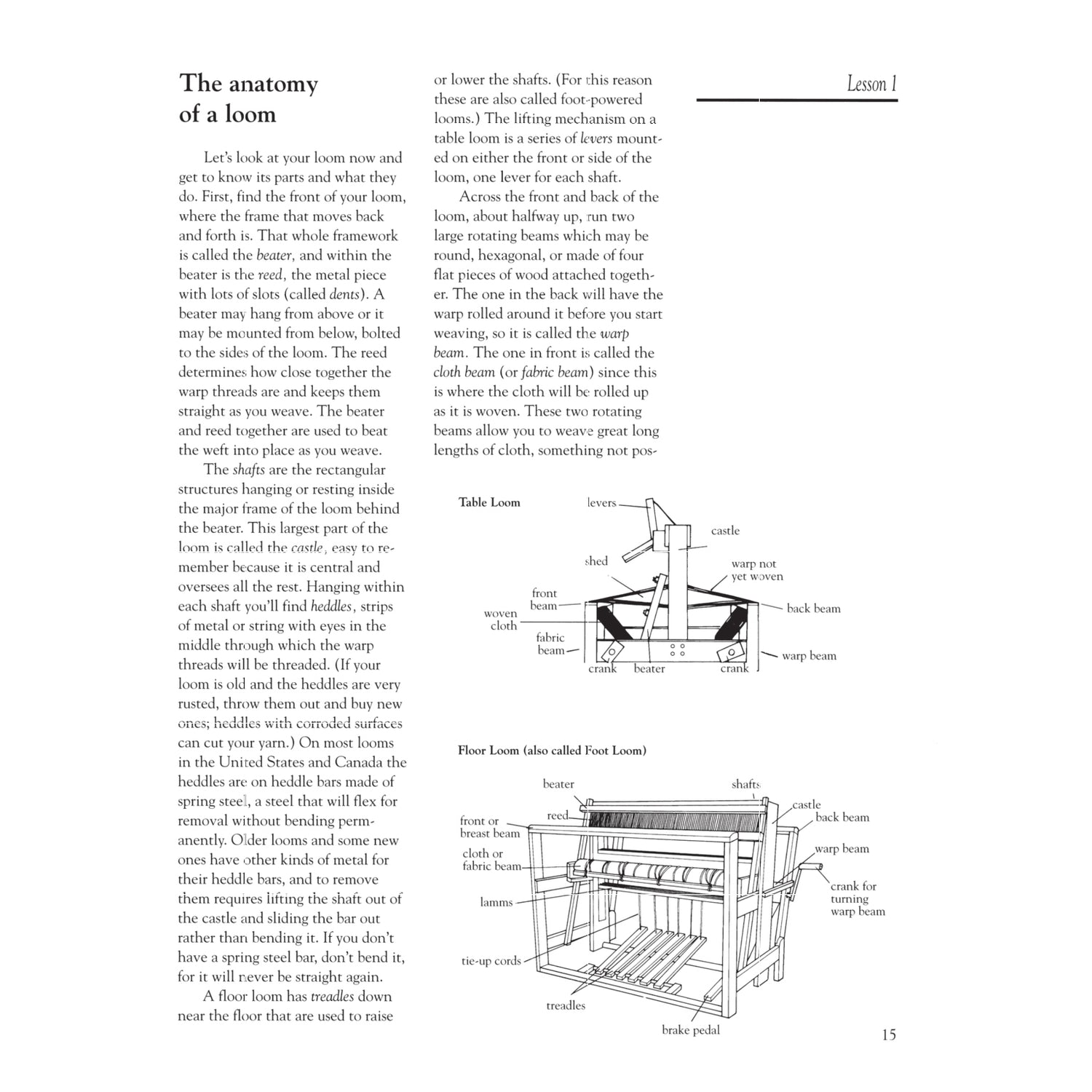 Written with a mentoring voice, each lesson includes friendly, straightforward advice and is accompanied by illustrations and photographs. Budding weavers need only to approach this subject with a sense of adventure and willingness to learn such basics as step-by-step warping, basic weaving techniques, project planning, reading and designing drafts, the basics of all the most common weave structures, and many more handy hints.