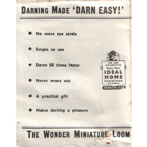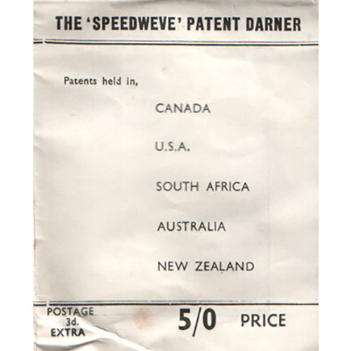 The original Speedweaver or Speedweve, was produced in England by E & A Chesstok in the 1940s and 1950s. The original concept was to provide a simple and easy tool to mend clothing during WWII on the homefront.