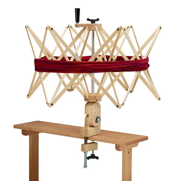 The Ultra Umbrella Swift is ingeniously designed to fit most tables. The Ultra turns freely on ball bearings and can be used vertically or horizontally. The wooden umbrella swift expands downward from the top to hold skeins up to 93" in circumference.