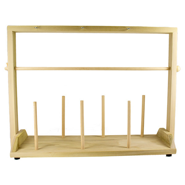 This handy winding station (spool holder, spool rack, cone holder, cone station, bobbin rack) can accomodate 6 large yarn cones on the base and four "soup can" spools (Maurice Brassard or Maysville) on the cross member.